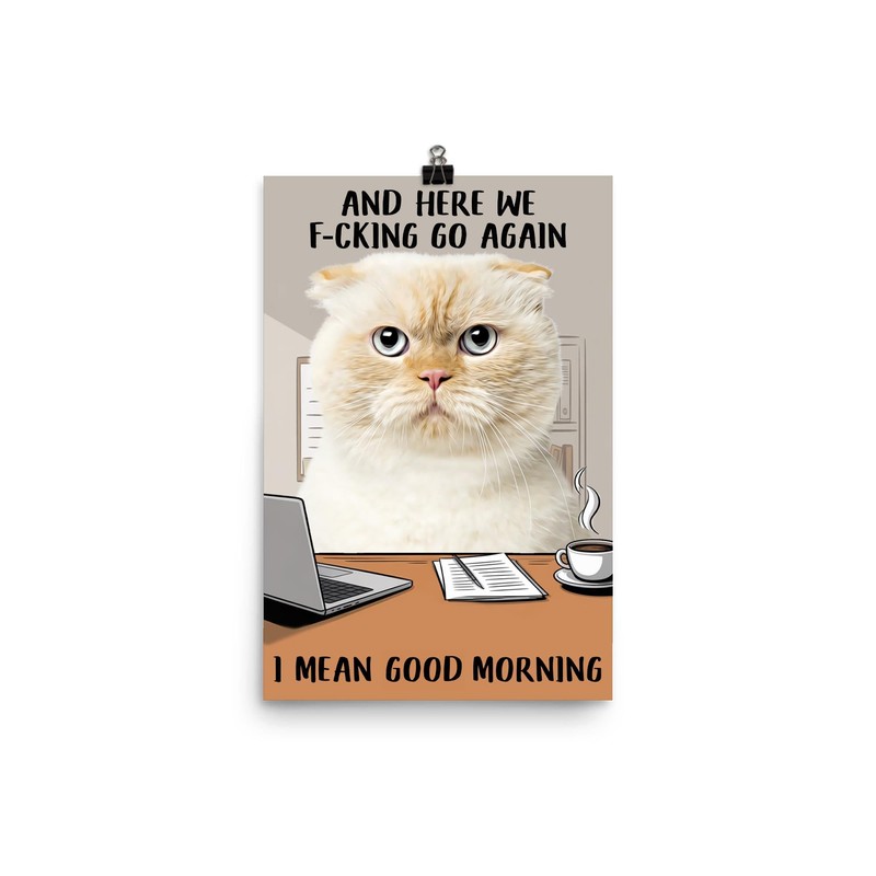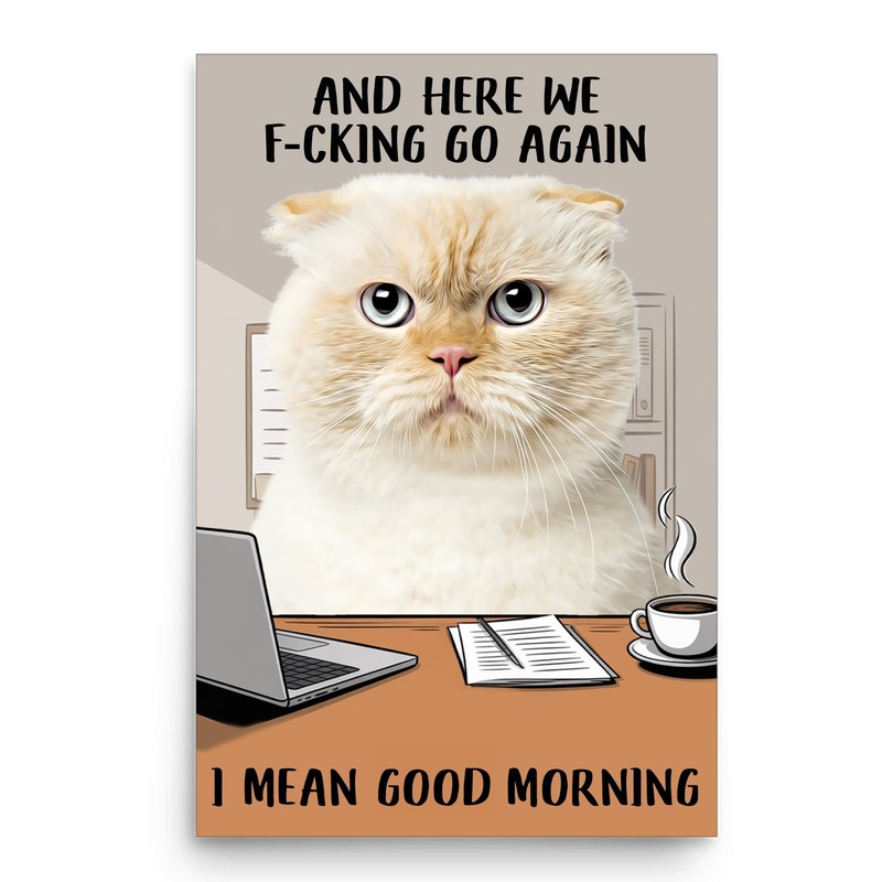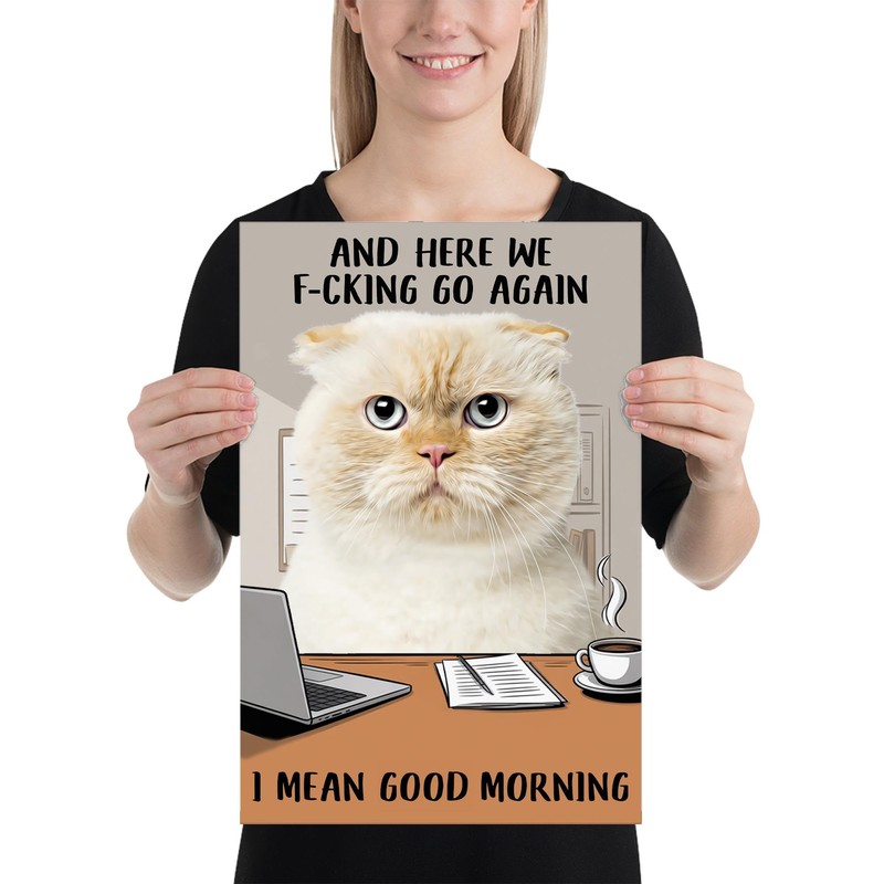 Funny Saying And Here We F-cking Go Again Wall Art - Cream Scottish Fold Cat Poster 12x18 Unframed Photo Paper - Sarcastic Work Humor Office Decor Gifts for Cat Lovers