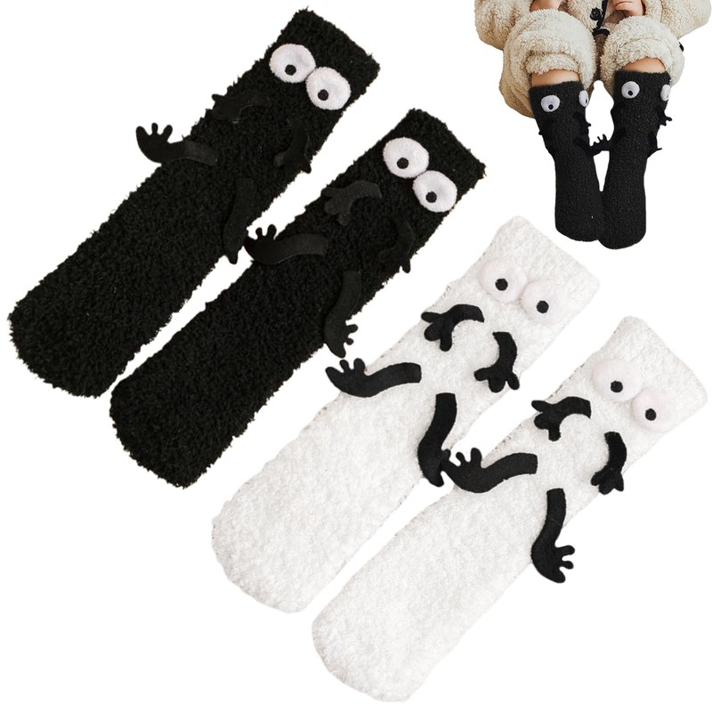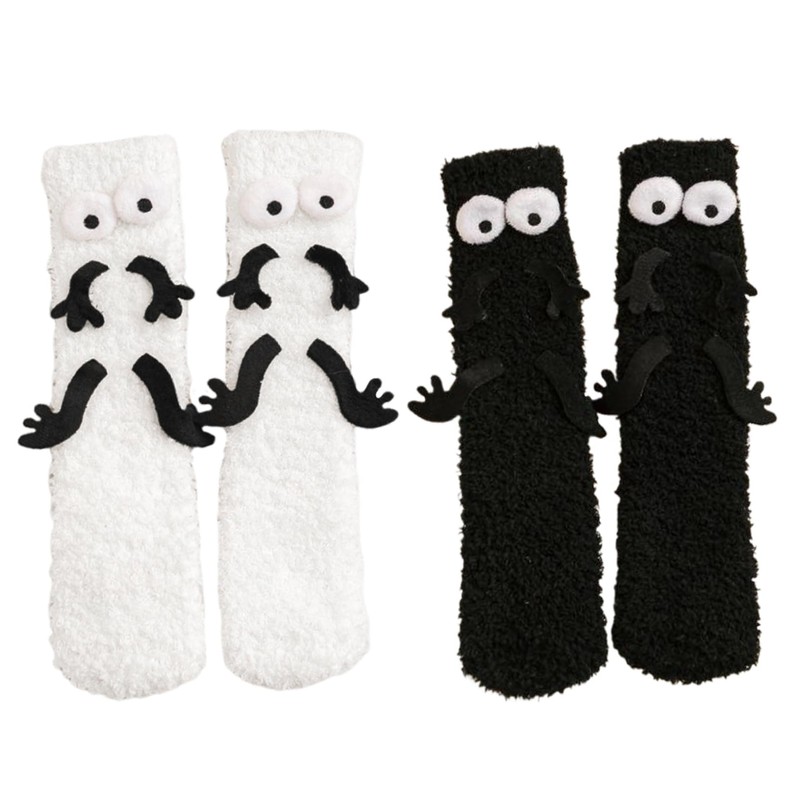 Funny Socks Fuzzy Cozy Thick Warm Holding Hands Socks with 3D Eyes, 2 Pairs Non Slip Crazy for Kids, Mid-tube Couple Slipper for Winter Sleep Home-