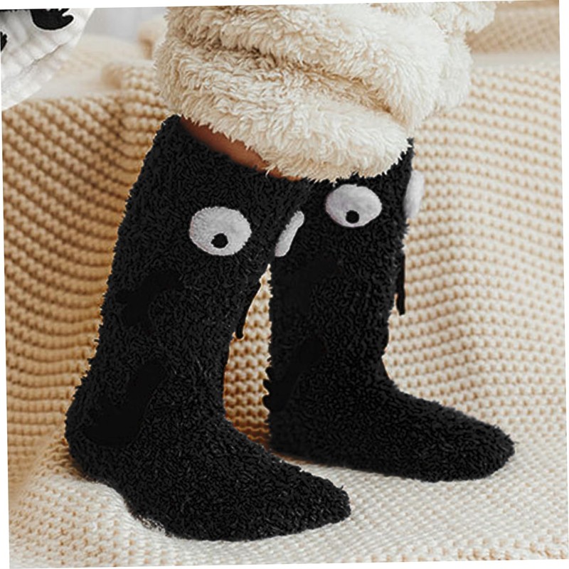 Funny Socks Fuzzy Cozy Thick Warm Holding Hands Socks with 3D Eyes, 2 Pairs Non Slip Crazy for Kids, Mid-tube Couple Slipper for Winter Sleep Home-