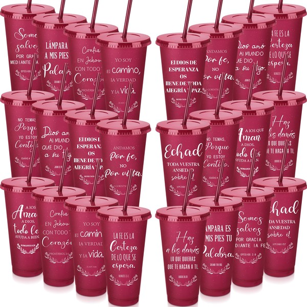 Funnymoom 24 Packs Inspirational Christian Gift for Women Men Spanish Bible Verse Tumbler Bulk 24 oz Plastic Tumblers with Lids and Straw Religious Cup Church Gifts for Sunday School (Wine Red)