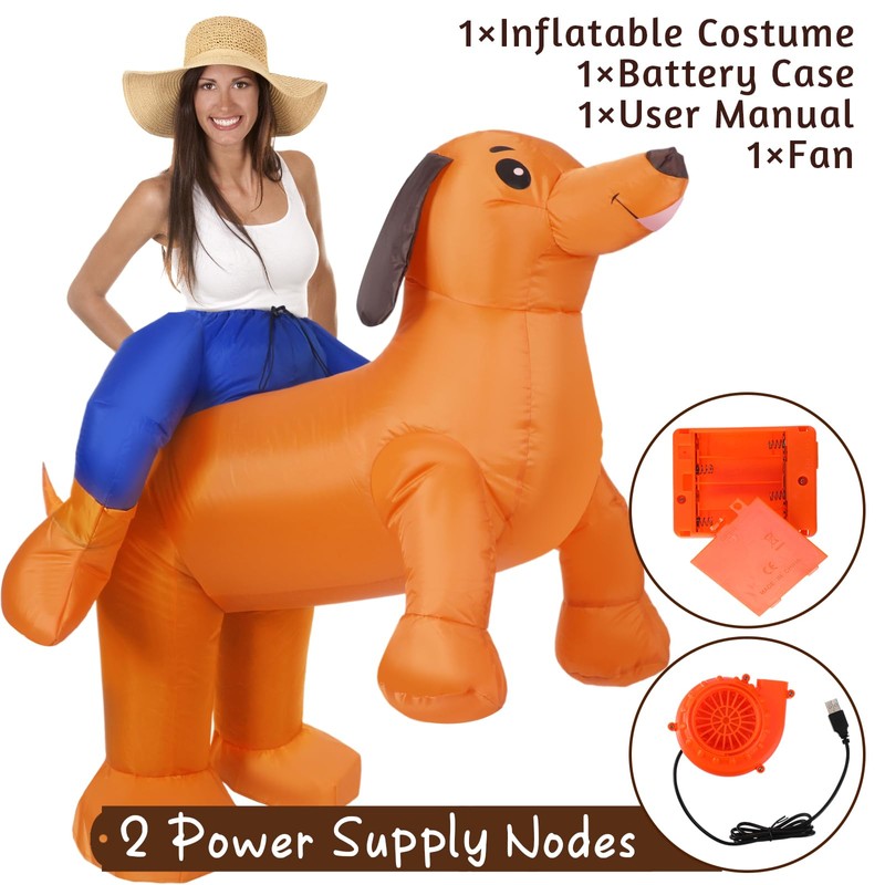- Package Includes: package includes 1 inflatable dachshund costume, 1 air pump, 1 battery box with USB cable; The air pump needs 4 AA (not included) or USB plugged into a mobile power supply to operate, and deflation only requires power off