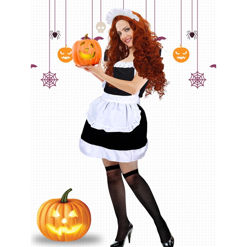 Funnysoft Maid Costume Set Includes Retro Frilly Aprons Curly Wig Mesh Socks Lace Headbands for Halloween Costume
