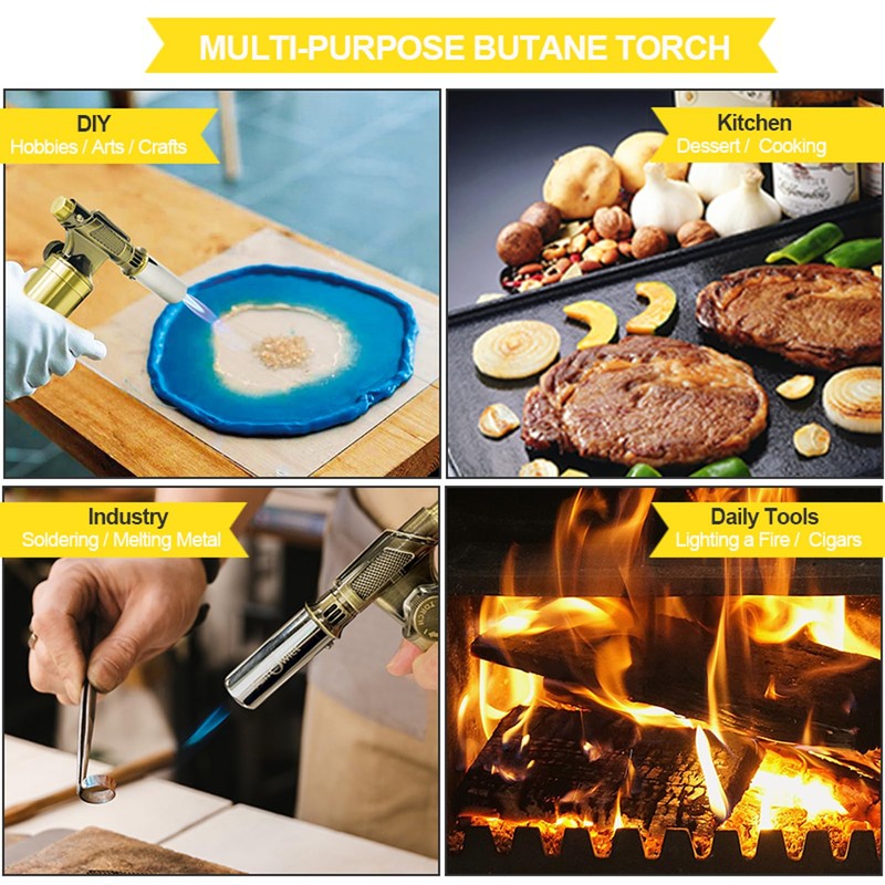 - Linterna de soldadura portátil multiuso: la linterna de mano profesional es una herramienta versátil y es adecuada para diferentes aplicaciones, incluyendo cocina gourmet, barbacoa, postres, pasatiempos, proyectos de arte y manualidades de resina, fabricación de joyas, dentales, pequeñas aplicaciones de soldadura, fusión de tubos congelados, iluminación de fuego, encogimiento en caliente, puñetazos, etc. El encendedor es fácil de usar, la temperatura máxima de hasta 1430 °C, que es suficiente para fundir varios metales como la plata y el aluminio.