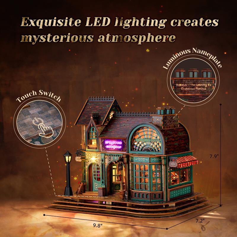 FUNPOLA LED 3D Wood Puzzle - Magic Bookshop Building Model Kit - DIY Miniature Magical Bookstore - 3D Puzzle Architecture Craft Gift for Adults