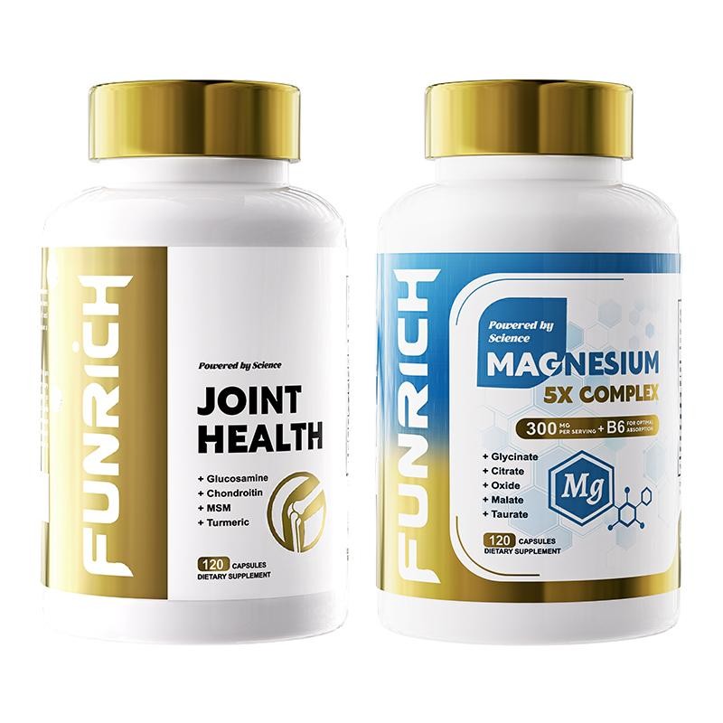 Experience all-day support with the FUNRICH Move & Relax Bundle, expertly formulated to enhance joint mobility, muscle comfort, and overall relaxation. This powerful duo combines advanced joint support ingredients like Glucosamine, Chondroitin, MSM, and Turmeric with five highly bioavailable forms of Magnesium. Designed for active lifestyles and those seeking daily wellness, it helps reduce joint stiffness, support flexibility, ease muscle tension, and promote restful sleep. Whether you're recovering from workouts or managing everyday stress, this bundle provides comprehensive support for your body and mind. Each bottle is made with premium ingredients and backed by strict quality standards. Feel the difference in movement and relaxation with FUNRICH’s all-in-one solution.