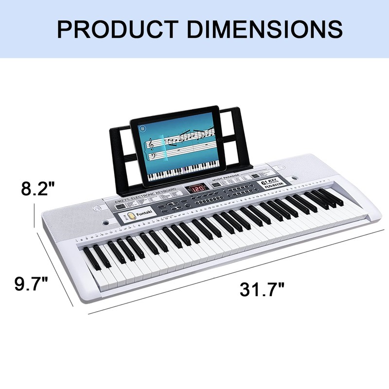 - ♫【2 TEACHING MODES & PERFECT for ALL AGES】Funtaki 61 light up keys Mini keyboard piano with 2 powerful teaching modes, teaching lights lead you to step by step from beginner practitioner to advanced level. And piano note stickers help you more easily to learn and memorize the music theory, musical notations and keys positions. Designed for beginners, adults and music lovers of all ages.