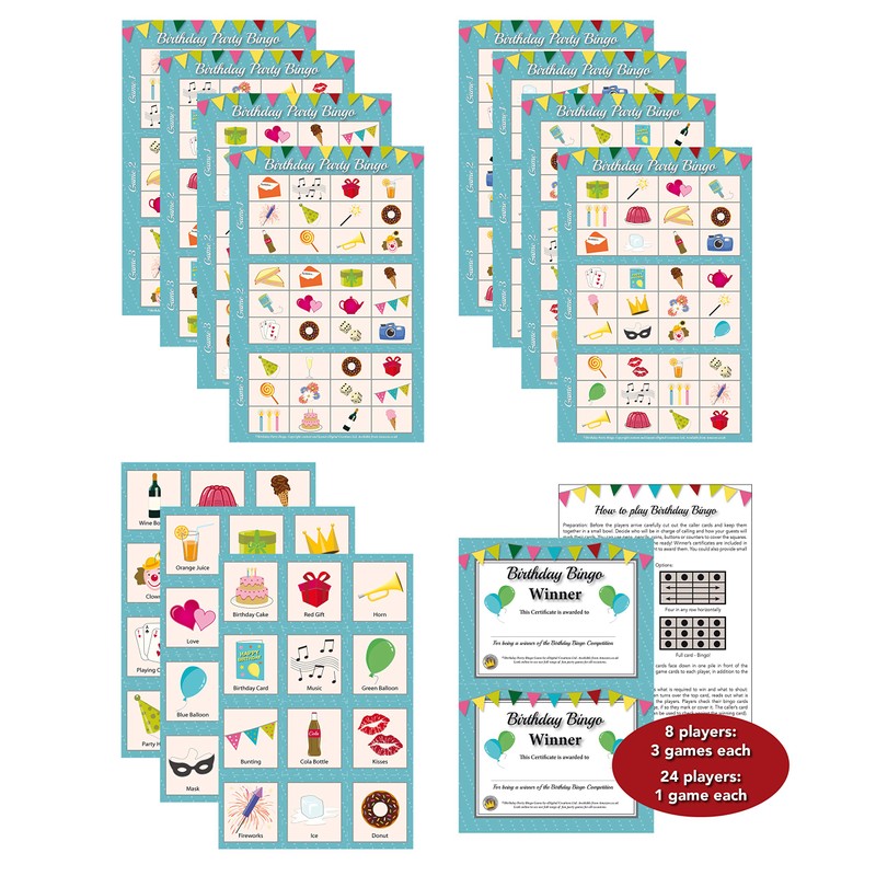 - FREE winners certificates are included in the pack, along with 8 birthday related Bingo games sheets (can be cut to provide play for up to a 24 players), caller's cards and instructions: providing complete, affordable fun & entertainment.