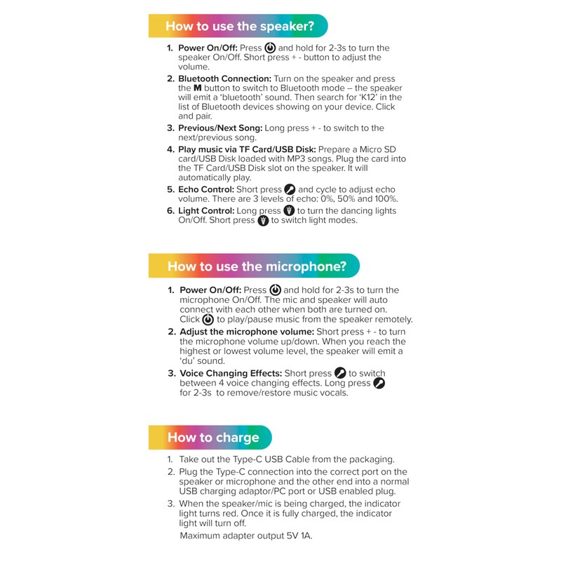 - 📱 Bluetooth Connectivity: Easily connects to your smartphone or tablet via Bluetooth, supporting all your favourite karaoke apps. Just sync and sing!