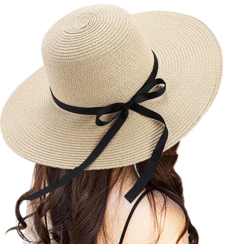 FunYun Sonnenhüte Floppy Faltbare Bowknot große breite Krempe Stroh Damenhüte Sommer Strandkappe UV-Schutz , L, beige