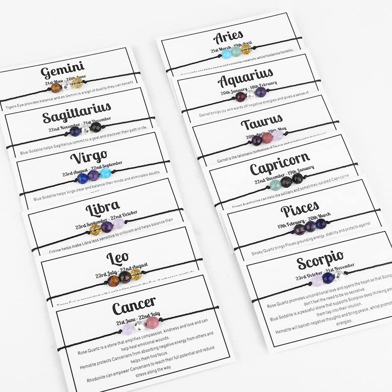 - 【MATERIAL & SIZE】- Each zodiac bracelet is made up of three 6mm natural stone beads, waxed cotton cord braided, Adjustable and measures Max 11" so should fit any wrist size. It comes presented on a beautifully designed keepsake card .