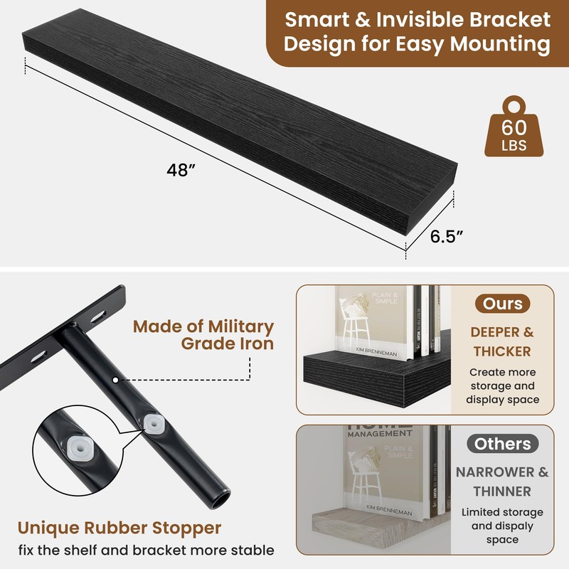 - Well-designed Floating Shelves: Our floating shelves for wall are made of premium engineered wood with a realistic wood grain finish. The rustic wood grain adds warmth and character to any modern or traditional interior. It can organize everyday clutter and make your space tidier, and make it full of aesthetic flare