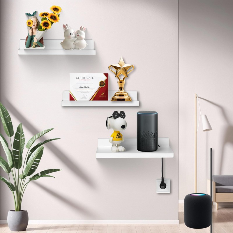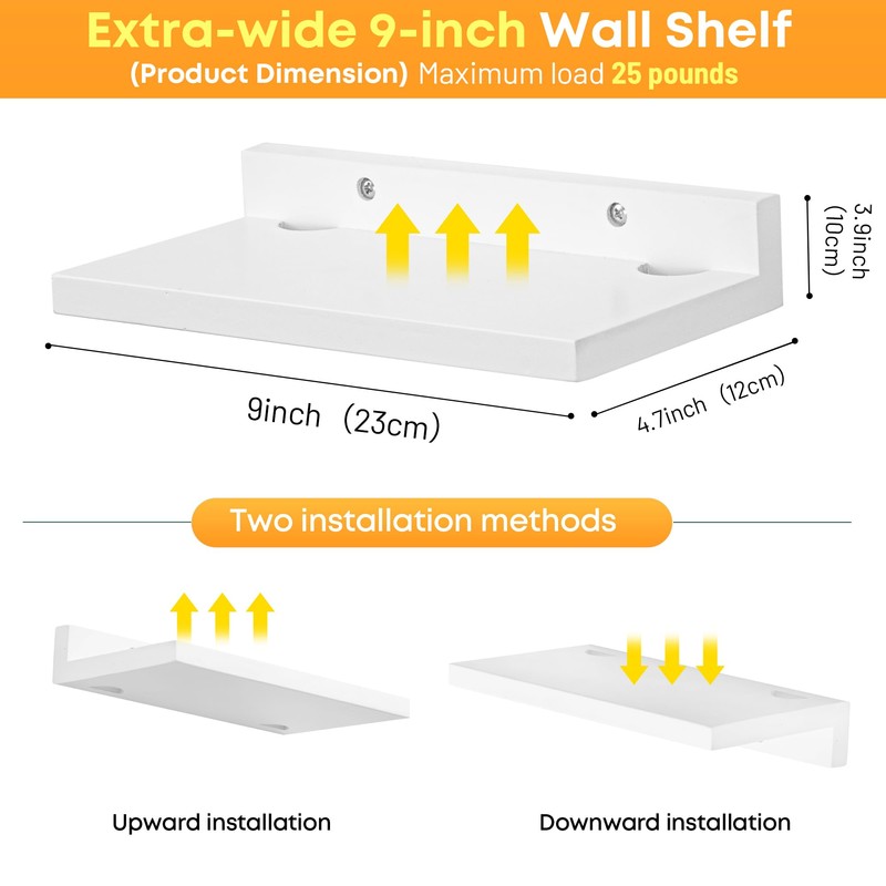 FURAOMEILI Small Floating Shelf for Wall,9 Inch Wall Mounted Shelf with Cord Hole,Small Display Shelves for Cameras, Webcam, Router,Smart Speaker,Action Figures-2 Pcs(White)