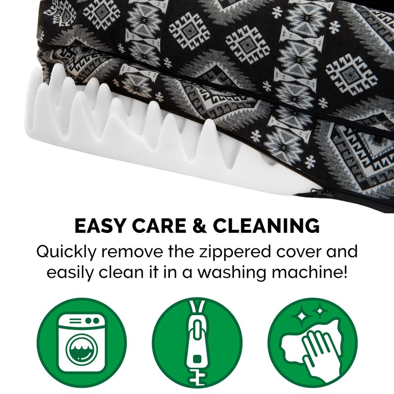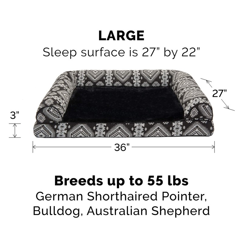 Finally, a solution for your arthritic pet's pain! This Furhaven Southwest Kilim Orthopedic Sofa Bed has a soft sleep surface providing your pet comfort while the orthopedic ("egg crate") foam base supports your dog's joints and pressure points. The Jumbo Plus option, for larger breeds, features solid slab orthopedic foam for greater support and comfort. The sofa bed has three walls to give your pup a variety of positions to lay in while remaining comfortable. Your best friend deserves a good night’s rest and now, it’s possible. With their very own orthopedic pet bed, your loved one will have maximum comfort for a great night's rest. Any position will do on this sofa bed! The squishy bolsters on three sides provide comfort for your pet to lay down in a variety of ways while always being provided the support they need. For example, your dog can lay on their tummy and use one of the bolsters as a pillow for a cozy night of sweet dreams. Cats love our sofa beds also! The bolsters provide cozy walls for your feline friend to snuggle into for their cat naps. This luxurious orthopedic pet couch provides a cozy spot for your companion to snuggle up in, leaving your favorite spot on the couch all for you! No more sharing the bed or finding pet dander on the couch. With soft side walls and a snuggly sleep surface your pet won’t need to count sheep to drift into a deep slumber on this orthopedic dog couch. To suit your home decor, this comfy dog bed is available in several stylish colors and, for your pet, there are five sizes to ensure maximum comfort while napping. The cover is easily removed and machine washable for your convenience. Make your pet’s dreams a reality by gifting them with sweet dreams on this cozy sofa bed!