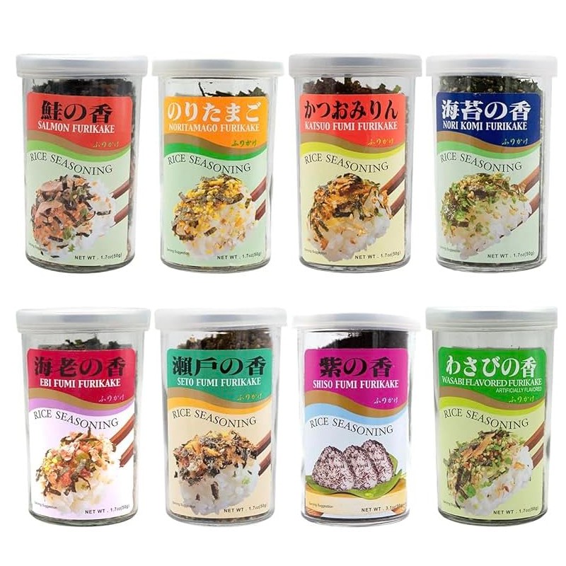 - Flavors Included Salmon Nori Komi (seaweed sesame) Noritamago (seaweed egg sesame) Seto Fumi (bonito seaweed sesame) Shiso Fumi (beefsteak plant) Ebi Fumi (shrimp bonito) Wasabi (spicy) Katsuo (bonito) Yasai