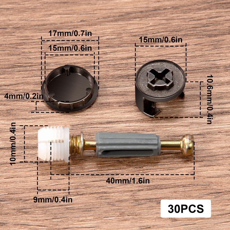 - The set includes: 30 sets of furniture fixing accessories, including eccentric wheels, connecting rods, decorative covers, sufficient in quantity to repair damaged furniture.