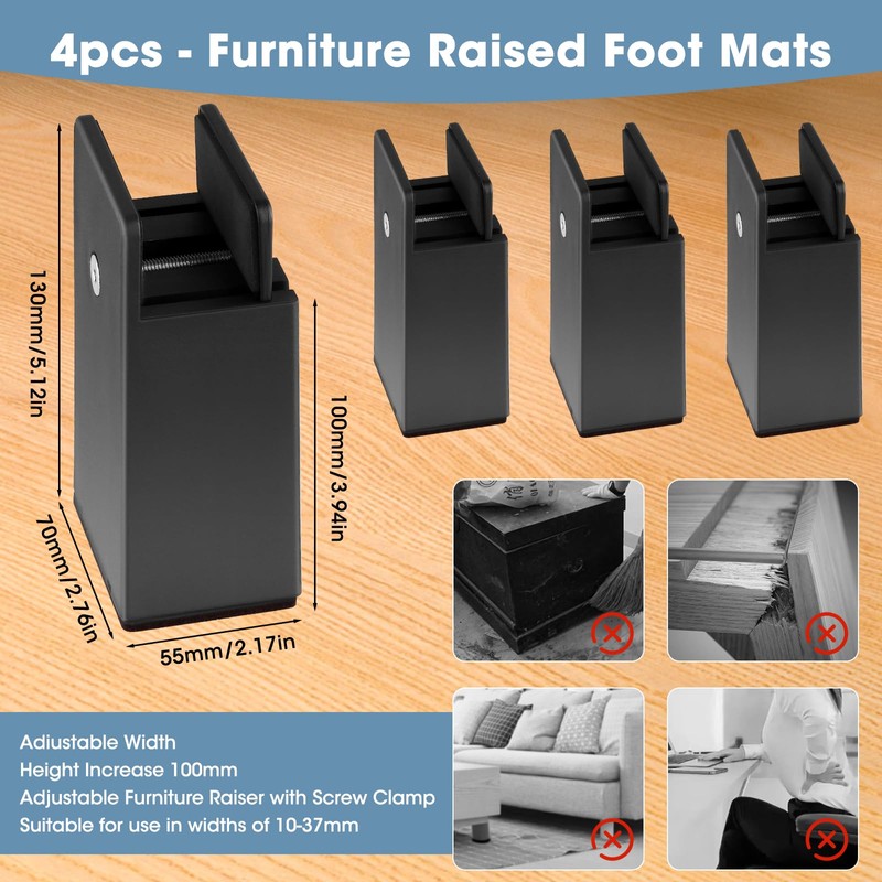 - Comfortable for people with poor cervical spine: adjustable bed risers with screw clamp. Increase the 10 cm height of the furniture in your home to an ergonomically correct height, making you more comfortable for the elderly to get in and out of bed. Avoid shoulder and neck pain caused by the low height of the furniture and cause a humping problem