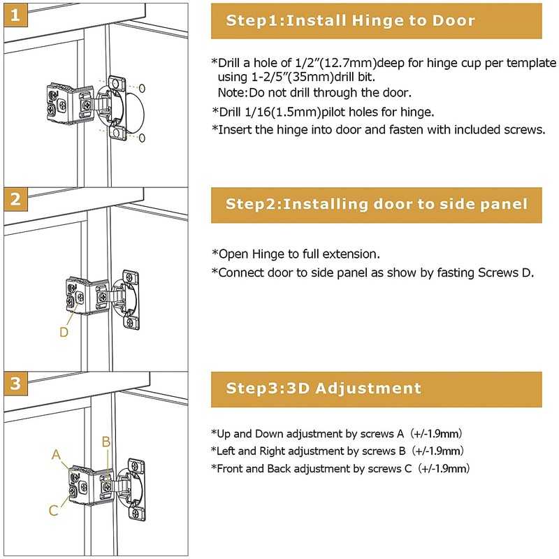 - 3D Adjustment Structure: Easily turn the screws on the soft closing cabinet hinges to adjust the cabinet door position (vertical, horizontal, depth) within several minutes to make a perfect fit.