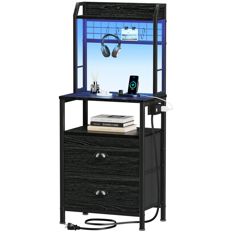 Furologee 41'' Tall Nightstand with Charging Station, Bedside Table with LED Lights, End Table with Drawers and Storage Shelves, Black Night Stand with Pegboard, for Bedroom/Living Room/Study Room