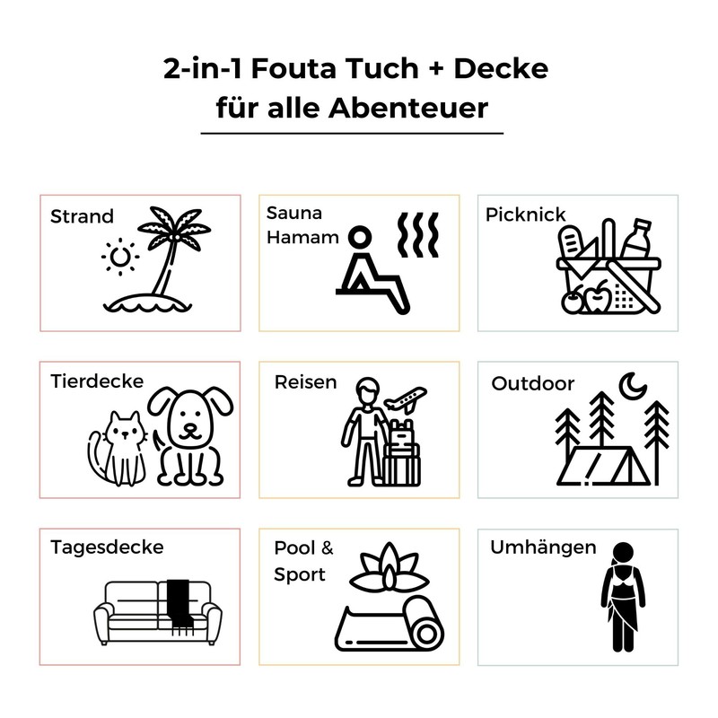 - Versatile use as a beach towel, sauna lounger towel, to wear around your hips or shoulders, as a picnic beach blanket and for more adventures!