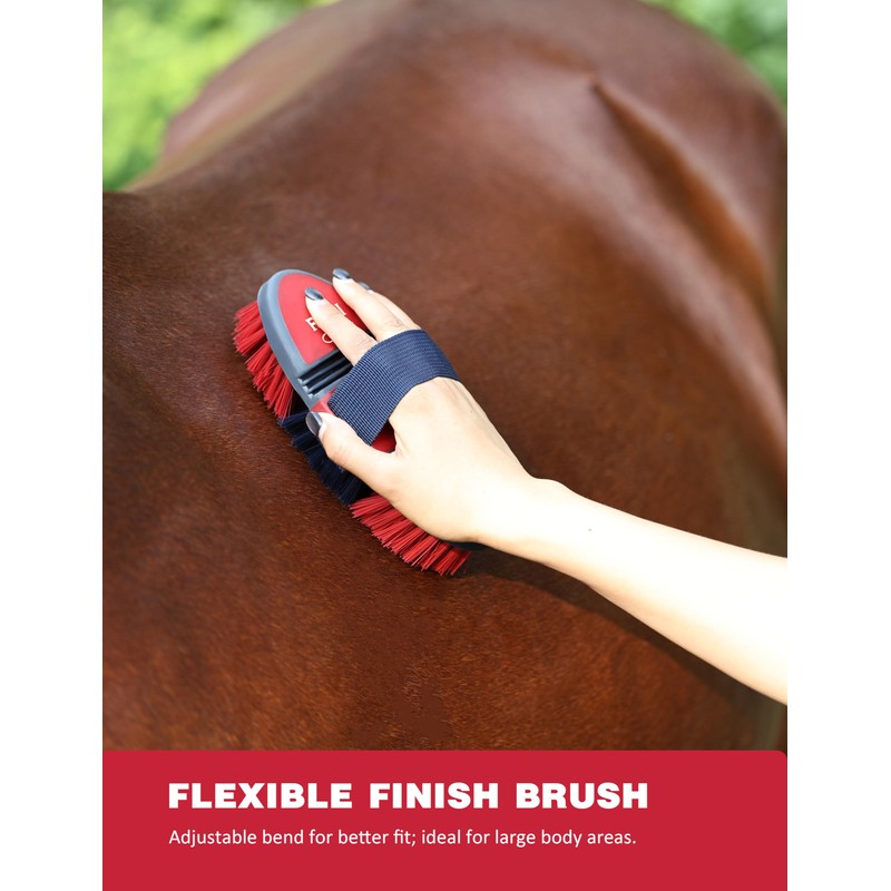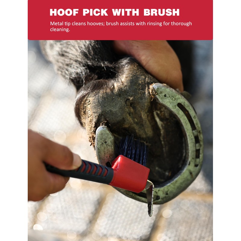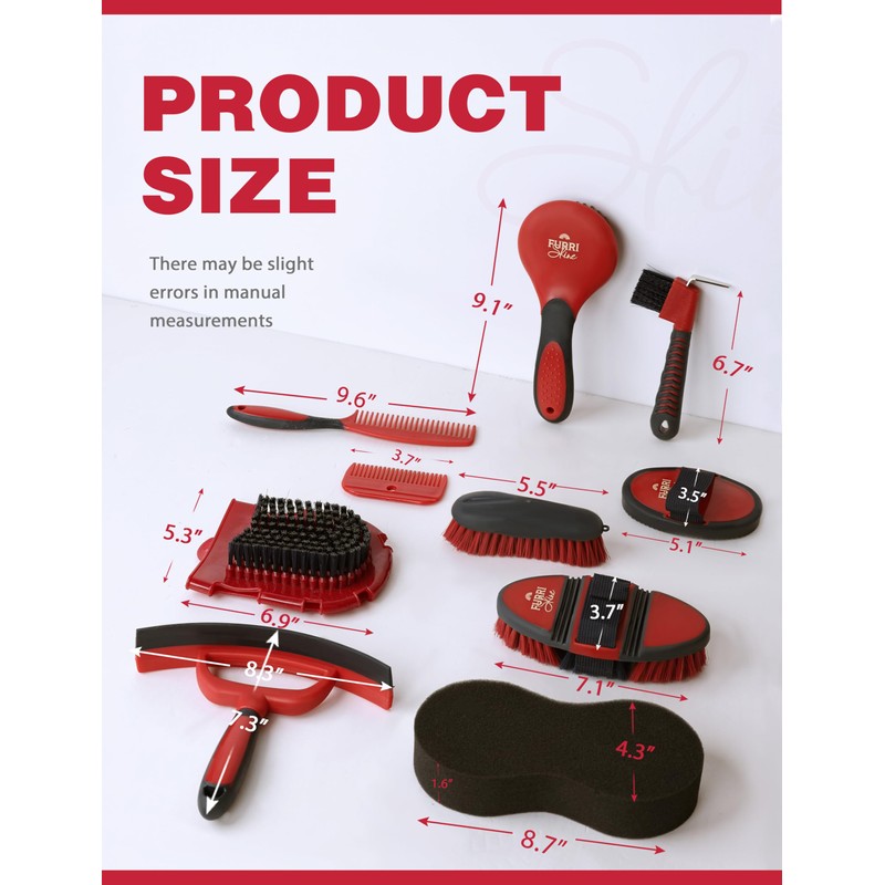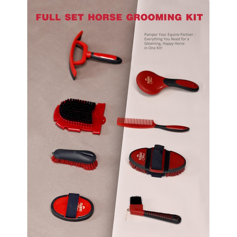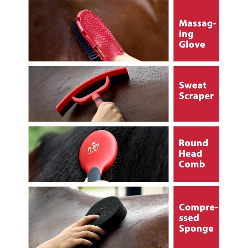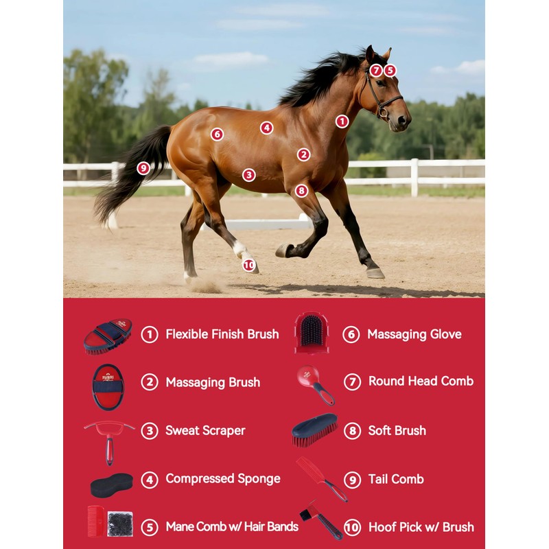 - 11-Piece Grooming Kit Includes: This horse grooming kit includes Flexible Finish Brush, Massaging Brush, Sweat Scraper, Compressed Sponge, Massaging Glove, Round Head Comb, Soft Brush, Tail Comb, Hoof Pick w/ Brush, and Mane Comb w/ Hair Bands. This comprehensive set provides everything you need for a full grooming routine - from deep cleaning and detangling to final styling touches.