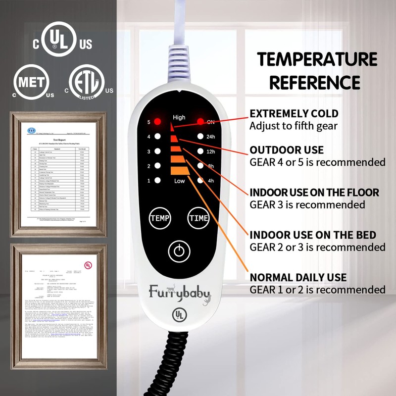 - SMART SWITCH - The pet heating pad has 5 timer levels(4h/8h/12h/24h/always on) and 5 levels of adjustable temp(from 68℉ to 122℉ (±30℉)) as your pets need, give your pets a warm winter!