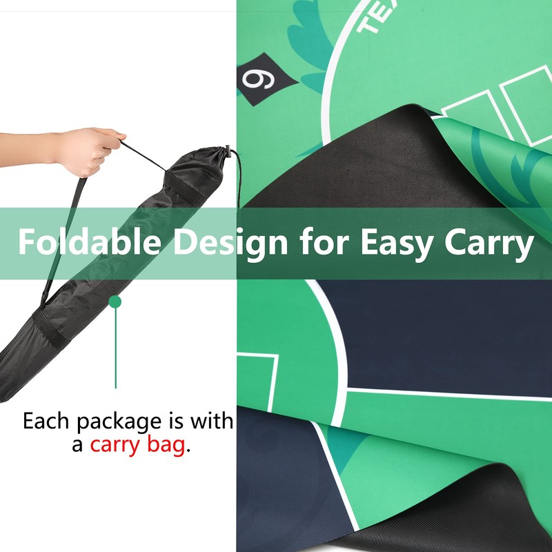 - [FOLDABLE DESIGN] Unlike other felt tops, it does not become fuzzy, this game layout mat can be simply rolled away for storage to save space over a poker table. So it is easy for you to take the game mat with included carrying bag if there is a party outside or go camping. What’ more, you will feel free to carry it and enjoys compact design.
