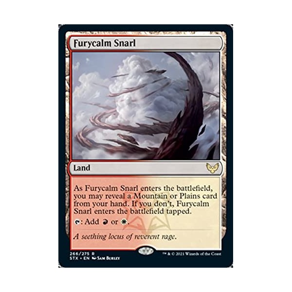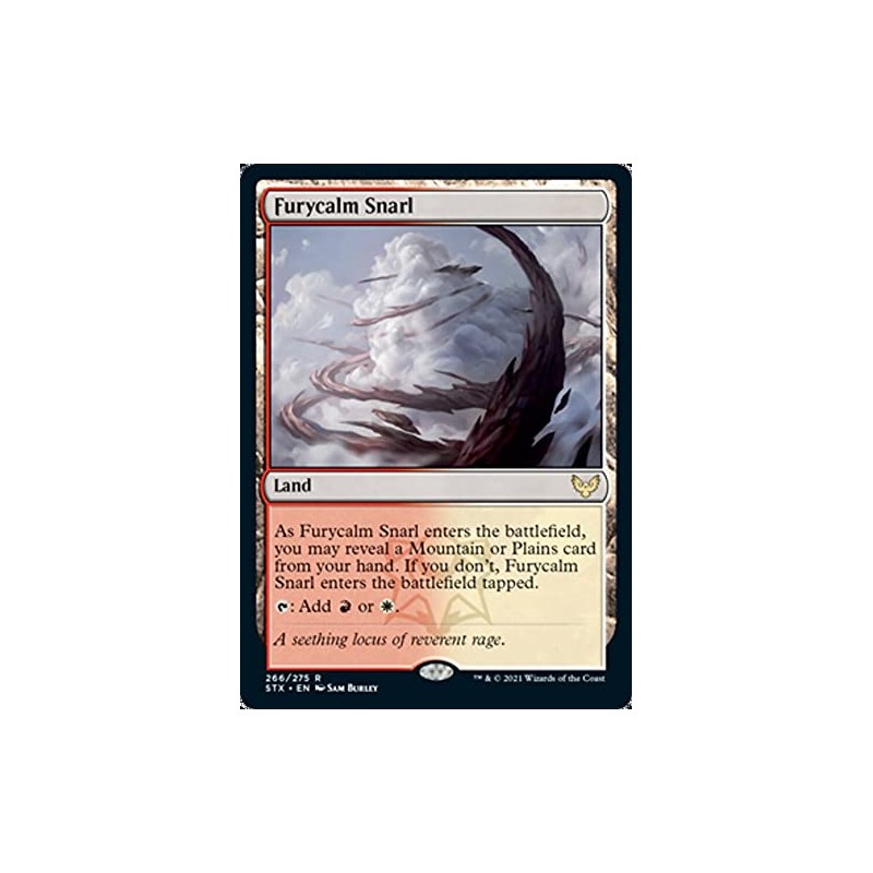 Land ----- As Furycalm Snarl enters the battlefield, you may reveal a Mountain or Plains card from your hand. If you don't, Furycalm Snarl enters the battlefield tapped. {T}: Add {R} or {W}.