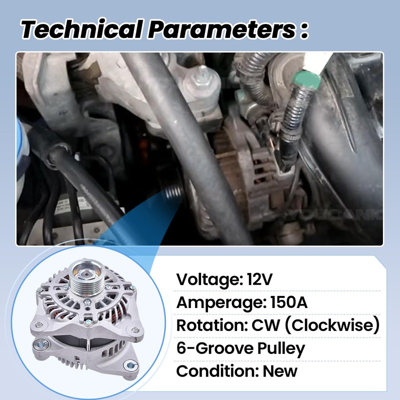 - Technical Parameters: Voltage: 12V; Amperage: 150A; Rotation: CW (Clockwise); 6-Groove Pulley; Condition: New