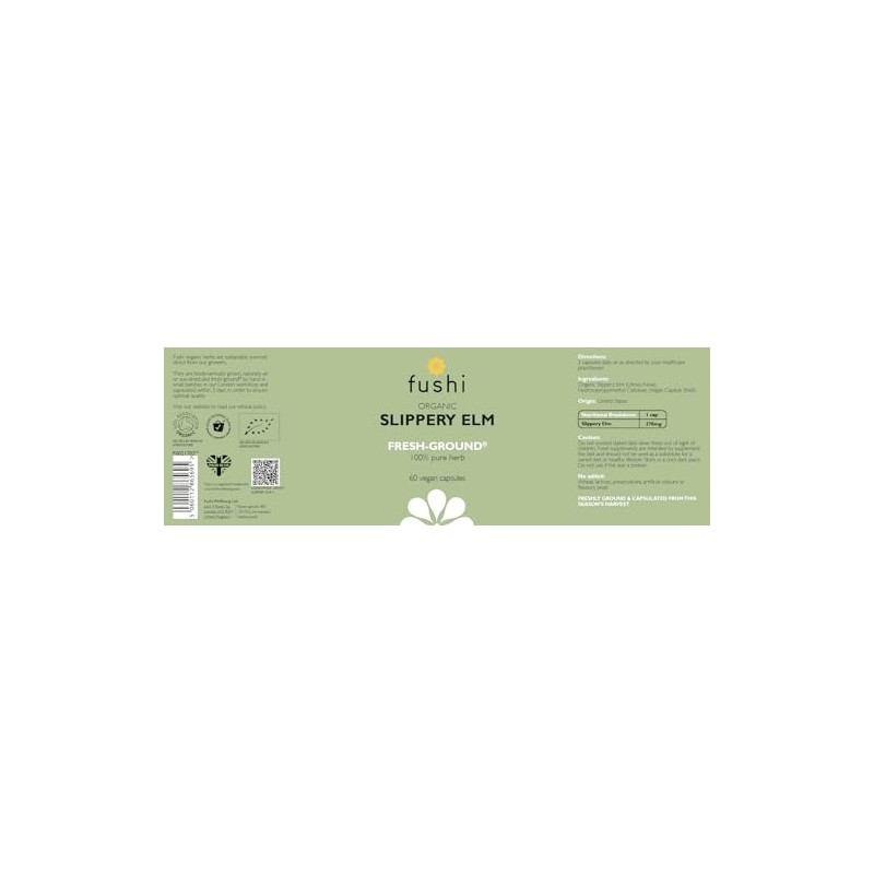Product DescriptionSlippery Elm has a mucilaginous quality which means that it has a soothing action. Slippery Elm helps support the stomach and the intestinal tract, with its soothing and healing action. Fushi herbs and superfoods are bio-dynamically grown, cold processed and 100% raw to retain their complete nutritional properties. They are grown and derived from sustainable sources. We believe in being honest to our customers, kind to our planet and responsible for our actions. DIRECTIONS Directions: 2 capsules daily or as directed by your healthcare practitioner. Do not exceed stated recommended dose. Caution: Use only as directed. Not recommended for pregnancy or breastfeeding. Food supplements should not be used as a substitute for a varied diet. Storage: Store in a cool dry place out of reach of children.Ingredients100% pure, biodynamically grown, organic Slippery Elm (Ulmus Fulva), Hydroxypropylmethyl Cellulose (Vegan Capsule Shell).Safety WarningDo not exceed stated daily dose. Keep out of sight of children. Food supplements are intended to supplement the diet and should not be used as a substitute for a varied diet or healthy lifestyle. Store in a cool dark place. Do not use if the seal is broken.Box Contains1 x Fushi Organic 500mg Slippery Elm 60 Vegetable CapsulesManufacturer Contact InformationFushi Wellebin