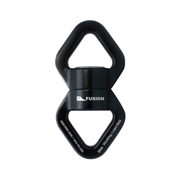 Fusion Climb Presto Delta Swivel Aluminum Alloy Rings Black \- The entire unit is made from high density aluminum alloy and mounted on sealed stainless steel ball bearings, making this high strength swivel extremely strong and durable. \- Both delta rings allow attachment of up to 3 carabiners for increased versatility to easily clip in back-ups or transition from one anchor to another. \- They also allow for a directional pull. \- It is ideal for use in lifting as it prevents twisting of the rope if weight shift occurs. \- Available in several colors and color combinations. \- Meets EN 362 standards. MBS 36kN