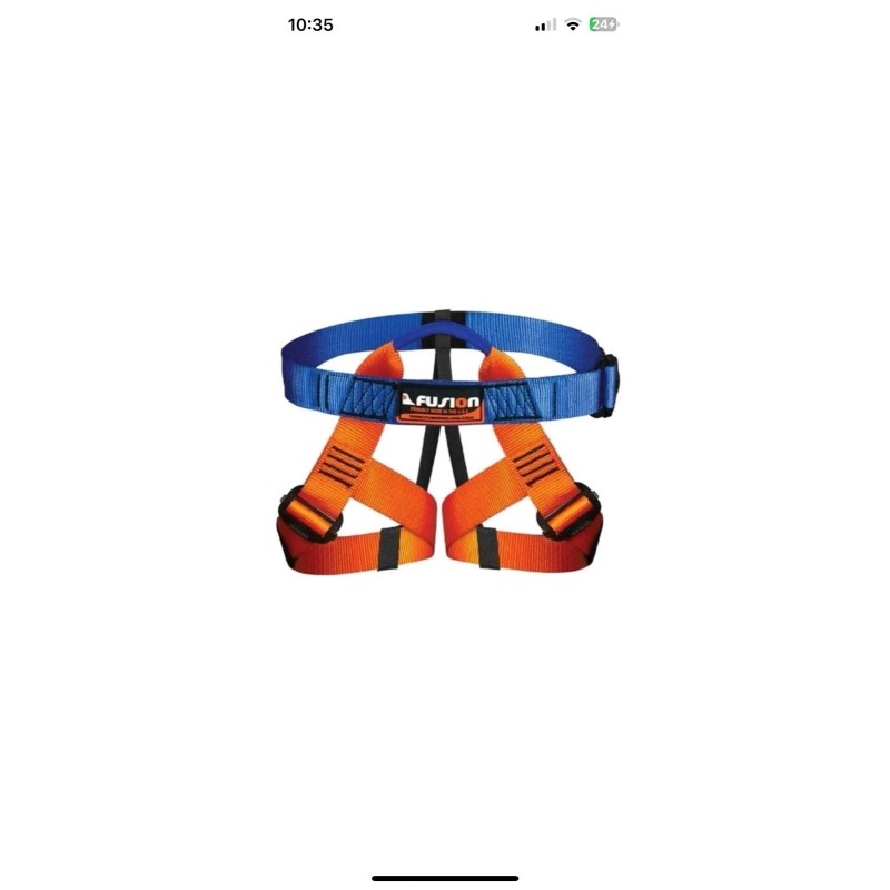 The FUSION Half Body Harness in size Small (Model kh-103-org-blu) features a D shape design, made of 100% nylon material in blue and orange colors. This harness from the Fusion brand is included in the All collection and comes with a hand wash only care instruction. With an item height of 10 inches, this regular fit harness is ideal for outdoor sports like climbing and caving, providing safety and support for users navigating challenging terrains.
