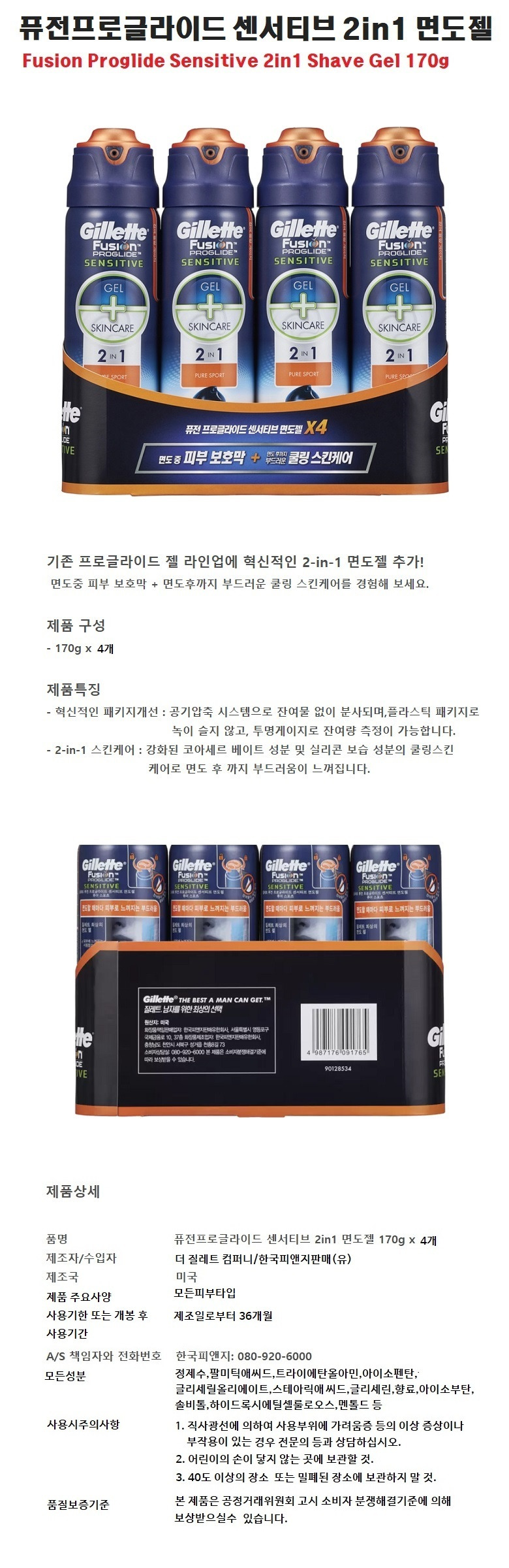 Fusion Pro Glide Sensitive 2in1 Shaving Gel 170g x 4pcs / 퓨전 프로 글라이드 센서티브 2in1 면도젤 170g x 4개입