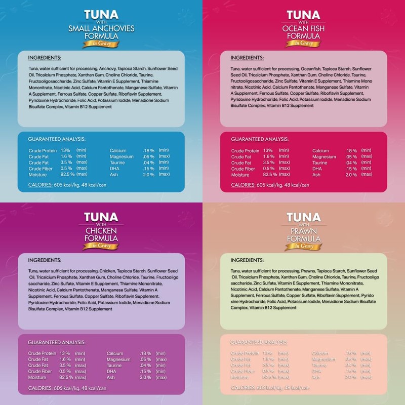 - Tuna & Ocean Fish x 3 - Tuna & Prawns x 3 - Tuna & Chicken x 3 - Tuna & Small Anchovies x 3