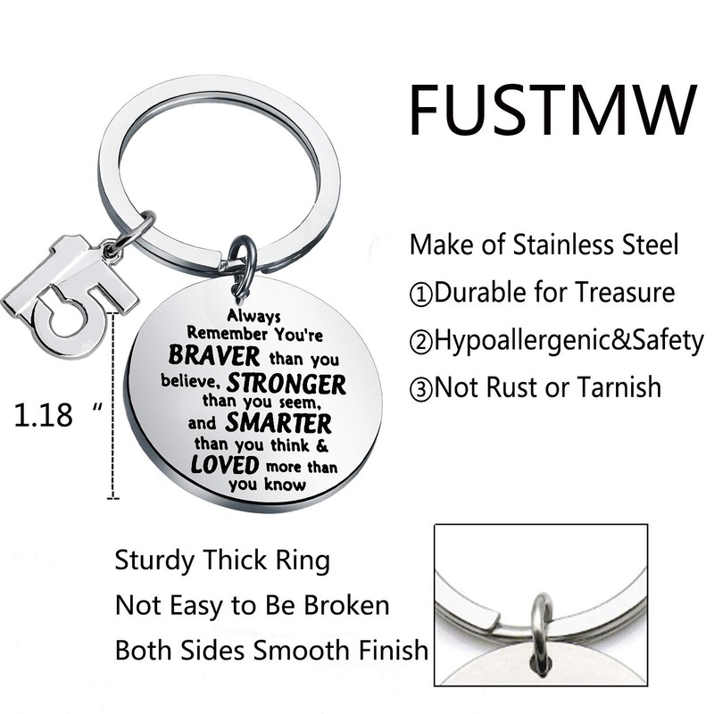 - Happy 15th Birthday Gifts - 15th Birthday Keychain hand engraved positive words Always Remember You’re BRAVER than you believe, STRONGER than you seem, and SMARTER than you think & LOVED more than you know. Let this words bring the receiver love, strength and hope.