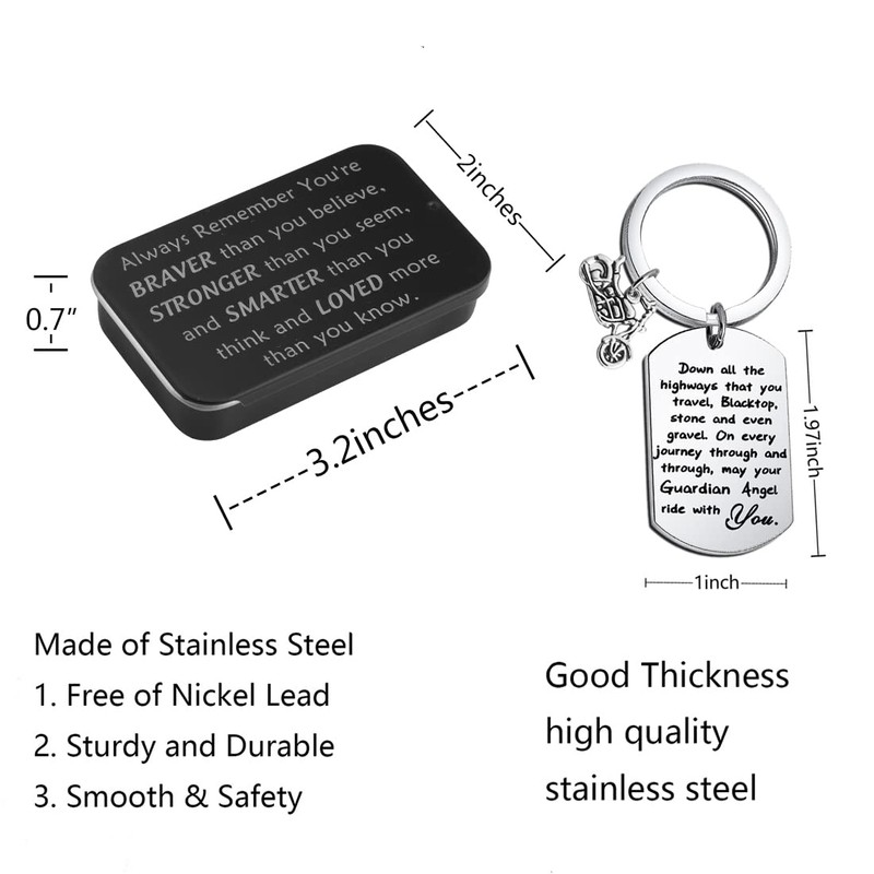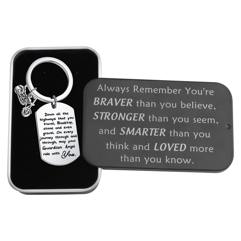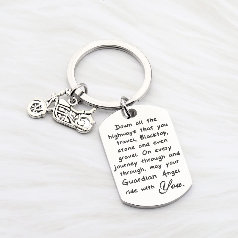 - ❥Ride Safe Keychain❥Biker Gifts for motorcycle riders engraved words: Down all the highways that you travel, Blacktop, stone and even gravel. On every journey through and through, may your Guardian Angel ride with you. Warm remind him/her to drive carefully.