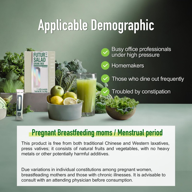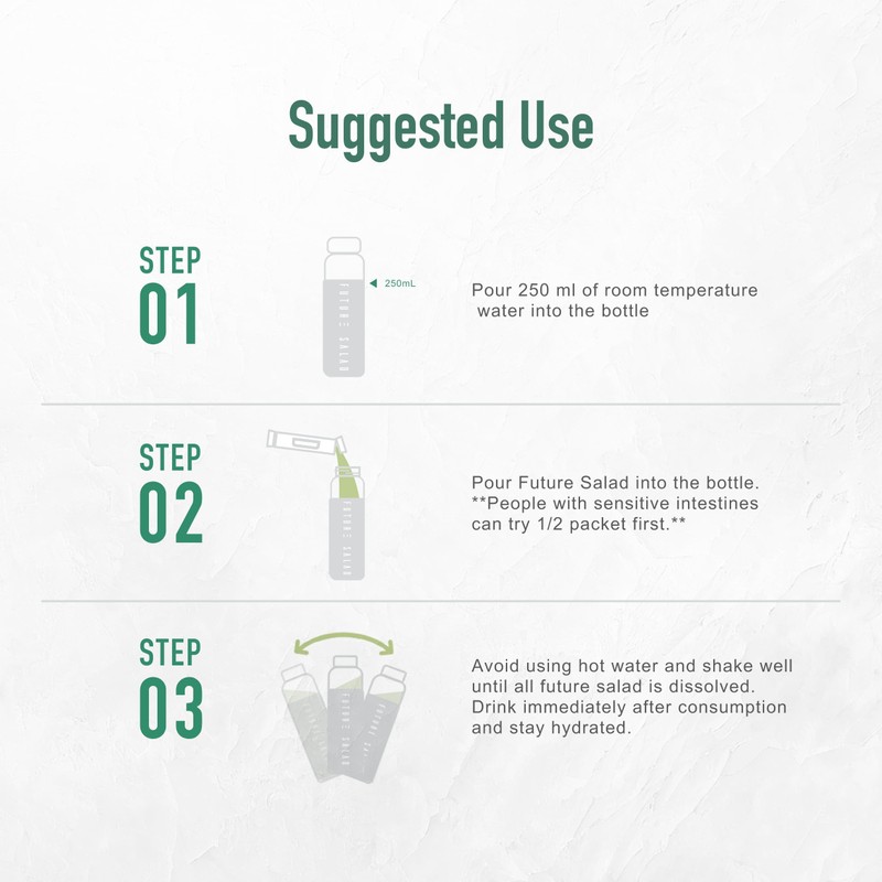Future Salad Drink Mix delivers the nutrition of 5 bowls of salad in a single sachet using advanced space food technology. Crafted with 12 plant-based superfoods, including moringa, spirulina, aloe vera, wheatgrass, green tea, and guava, this convenient powder is rich in fiber and essential nutrients to support your daily wellness routine.