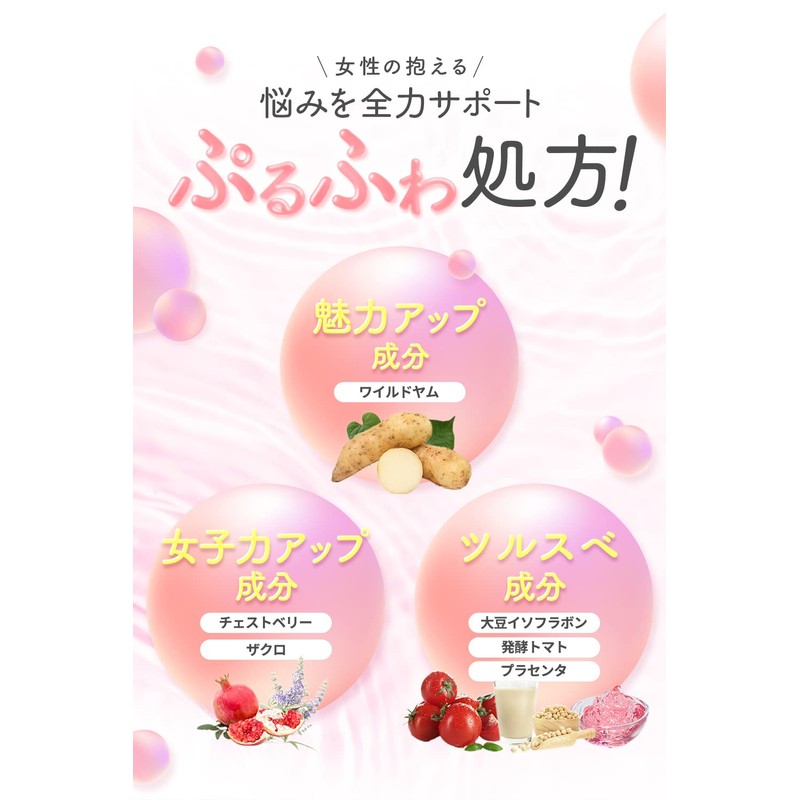 女性の悩みに真剣に向き合う自然派サプリ。 女性らしさを磨く天然成分ワイルドヤムを90mg配合。その他チェストベリー、プラセンタ、ザクロエキスなど5つの天然成分をバランスよく配合し、女性の悩みに対応します。健康被害・副作用報告があった成分を一切使用しない安全性へのこだわりで、内側から育む理想の身体づくりをサポートします。