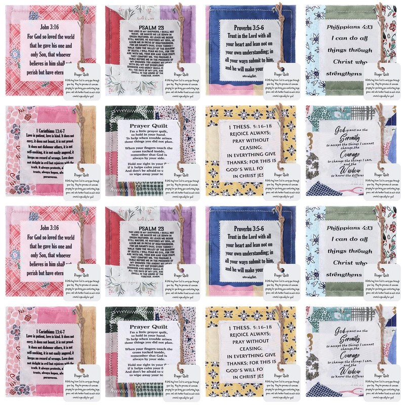 - Multipack Value: this package includes 16 individual pocket prayer quilts, 2 of each style, each containing a wooden mini cross inside; Whether for personal use or for sharing with friends and loved ones, this prayer cloth package offers excellent value for money