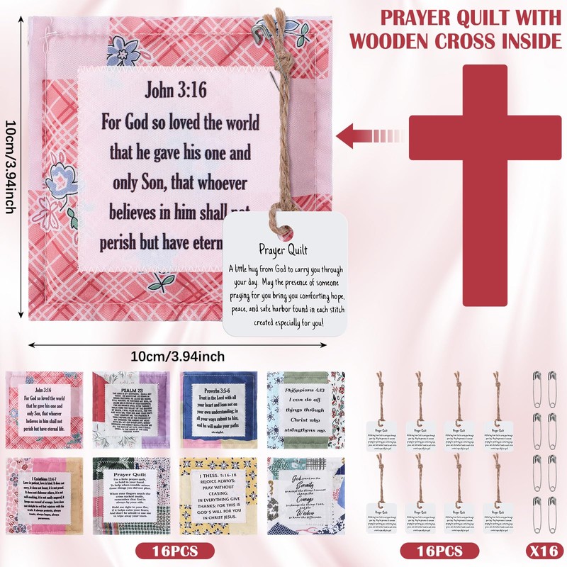 FuWeave 16 Pack Prayer Quilt with Cross Inside Squares Pocket Mini Scripture Prayer Quilt for Friend Family Colleague Encouragement Gift