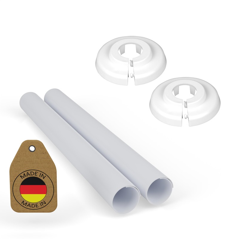 - Set: 2 plastic heating pipe trim + 2 rosettes, suitable for pipe diameter 15 mm. The length of the tube is 200 mm, can be easily cut with scissors/cutter knife as required
