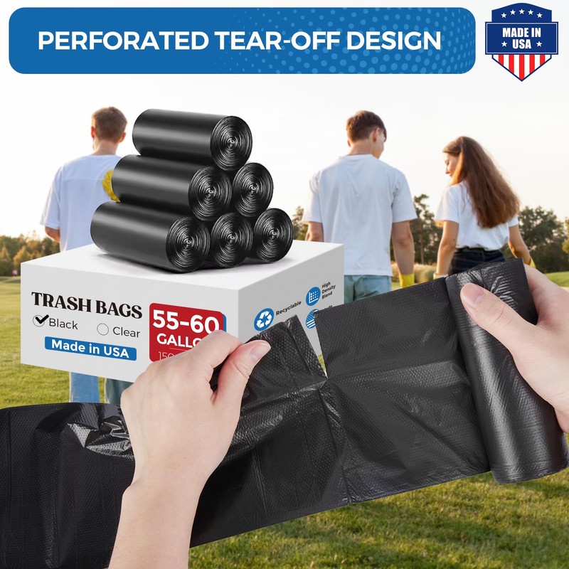 Introducing our premium 55–60 gallon black plastic trash bags, proudly made in the USA. Each package contains 100 heavy-duty bags, crafted to handle a variety of waste disposal tasks with ease and efficiency.