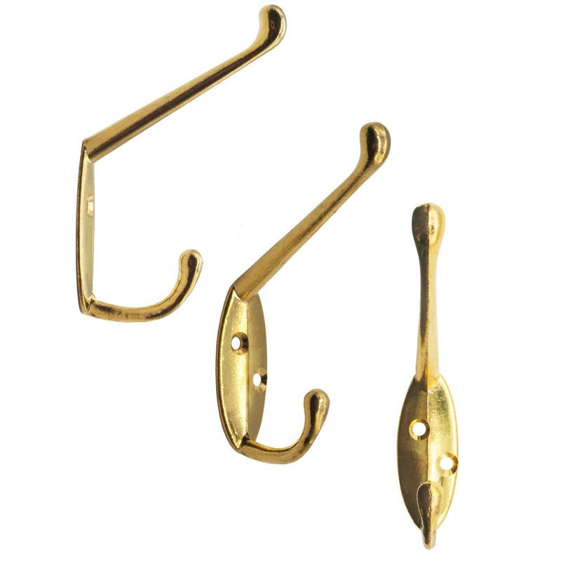- Elegant cast iron double hooks in antique brass gold design for versatile applications.