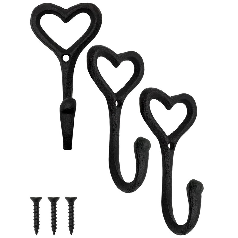 FUXXER Rustic Iron Hooks Cast Iron Heart Design Coat Hooks Set of 3 Black