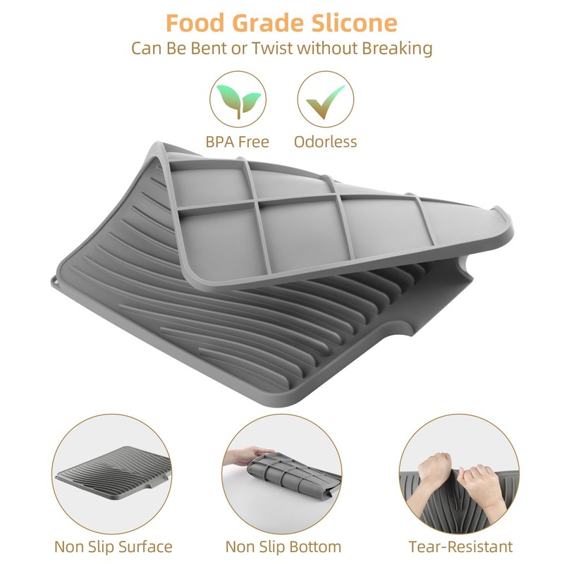 Fuyit Silicone Dish Drying Mat with Raised Drain Lip, Inclined Design, 16" x 13" Heat Resistant Non-Slip Mat for Kitchen Counter or Sink (Gray)