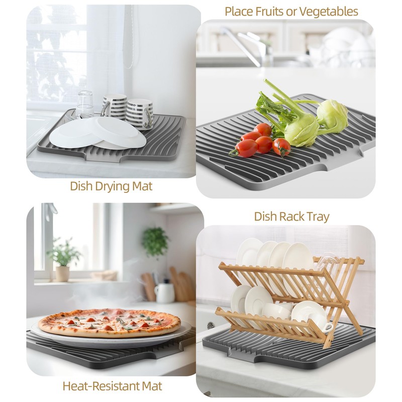 • Versatility: The silicone self-drying mat is a multifunctional tool, serving as a heat-resistant surface, coffee mat, dish rack liner, baking tray protector, pet feeding station, etc