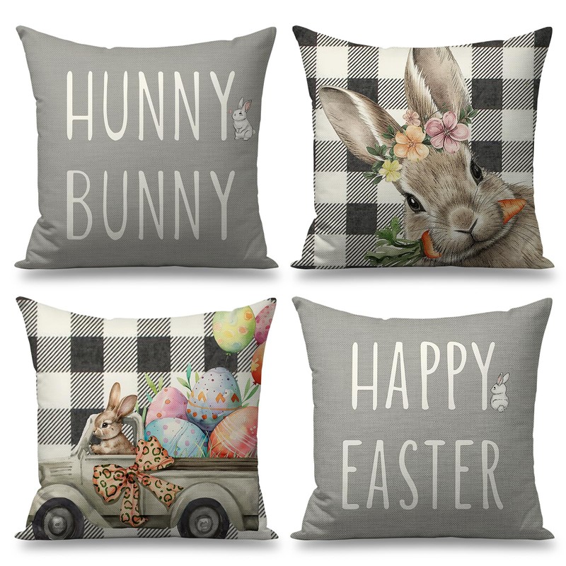 FUYUCHEN Happy Easter Pillow Covers 18x18 Set of 4 Hunny Bunny Rabbit Truck Eggs Buffalo Plaid Grey Throw Pillows Decorative Spring Pillowcases for Sofa Couch Home Farmhouse Holiday Decorations