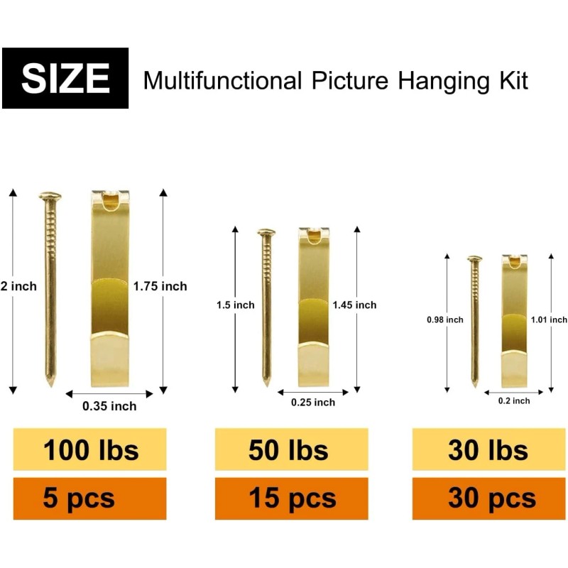 • 【Multifunctional Picture Hanging Kit】: You will receive 50 pcs picture hangers with different sizes, including 30 lbs (30 pcs), 50 lbs (15 pcs) and 100 lbs (5 pcs) which can meet your different needs from small pictures to heavier paintings.