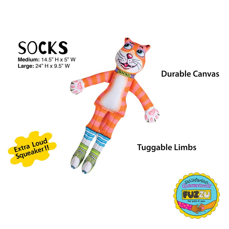 FUZZU Durable Dog Toy with Squeaker - Floppy Tough Chew Toy, That Sneaky Cat! - Socks, Large