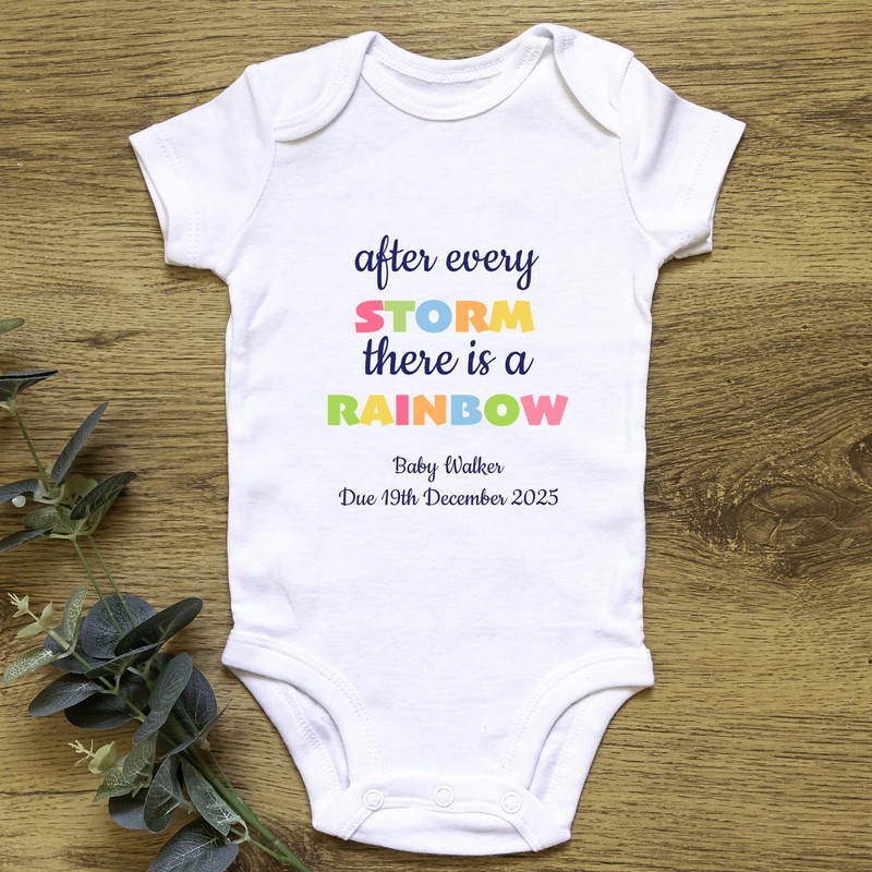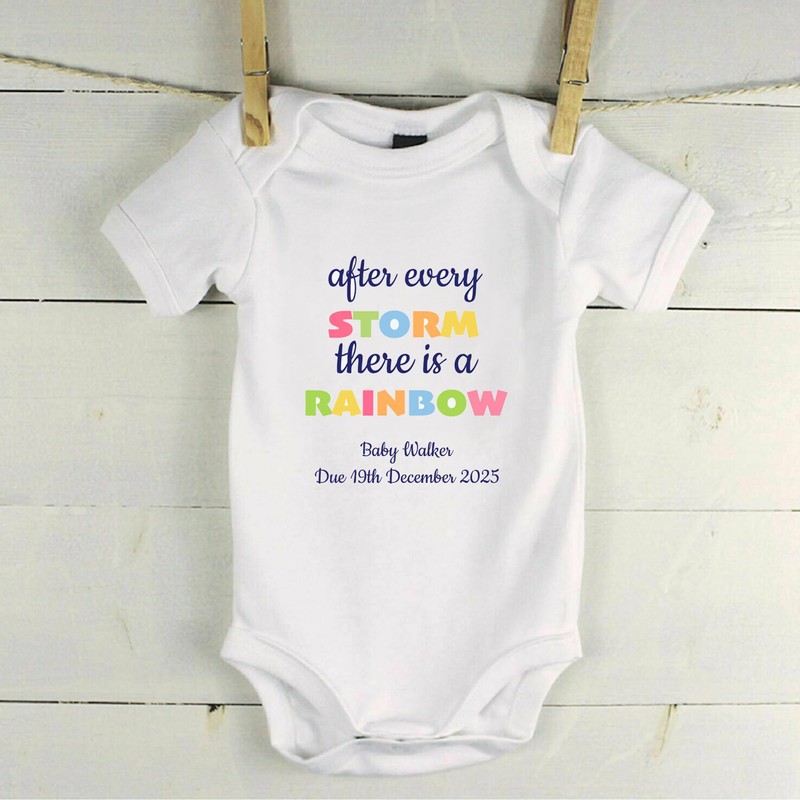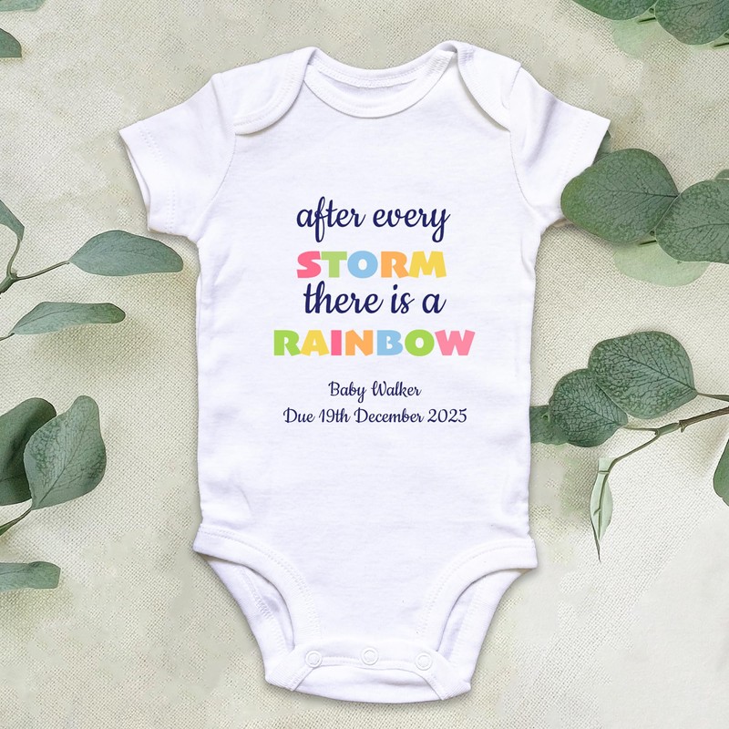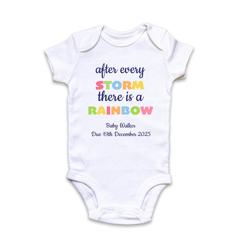 - Personalised "After Every Storm There is a Rainbow" Baby Grow - Add any Surname and Due Date onto our adorable baby grow, complete with a cute rainbow coloured lettering. It's a perfect way to share your Baby news with friends, Dads, Grandparents, Parents and other family either in person or as a Pregnancy Announcement on social media to announce your beautiful new Baby Girl or Baby Boy. Celebrate your Rainbow Baby by sharing your wonderful news. Your child will be so comfy in our super soft baby vest
