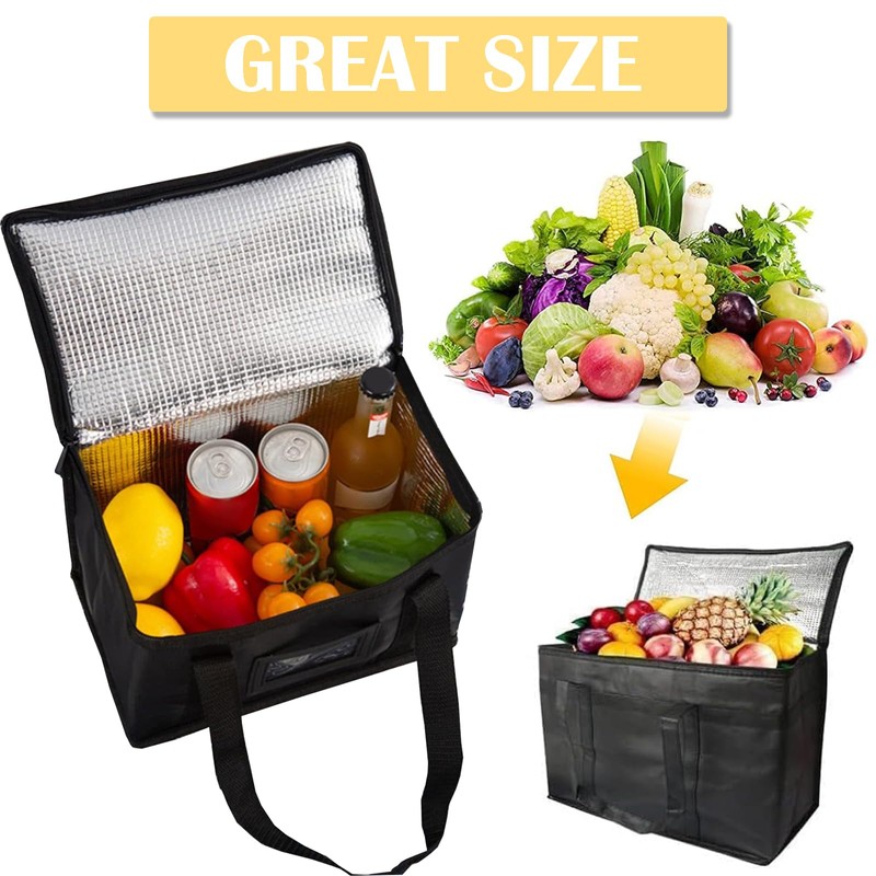 - 50ML Food Delivery Bag: 43*30*31 CM, which spacious enough to fit a large amount of grocery items while shopping at the grocery store or farmers market, carrying multiple orders when delivering food, or taking plenty of food for picnics, camping, catering, beach days, tailgating, potlucks, or parties.